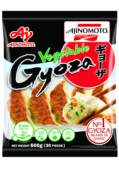 Añadir las verduras picadas, los gyozas y la salsa de soja.